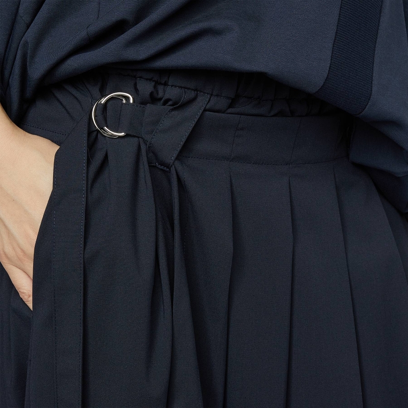 Hose aus glattem Viskose-Mischgewebe. Falten-Frontpanel für Pantagonna-Effekt, bei Bedarf abnehmbar für die Hose, mit zwei Knöpfen und einem Band mit Schnalle. Elastischer Bund und verdeckte Seitentaschen. Breite und bequeme Passform.
