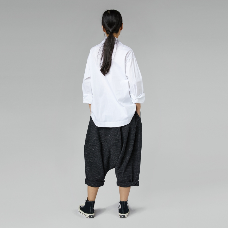 Hose aus meliertem gestreiftem Baumwoll-Mix. Elastischer Bund. Seitliche Eingrifftaschen. Sehr niedriger Schritt. Breite und bequeme Passform.