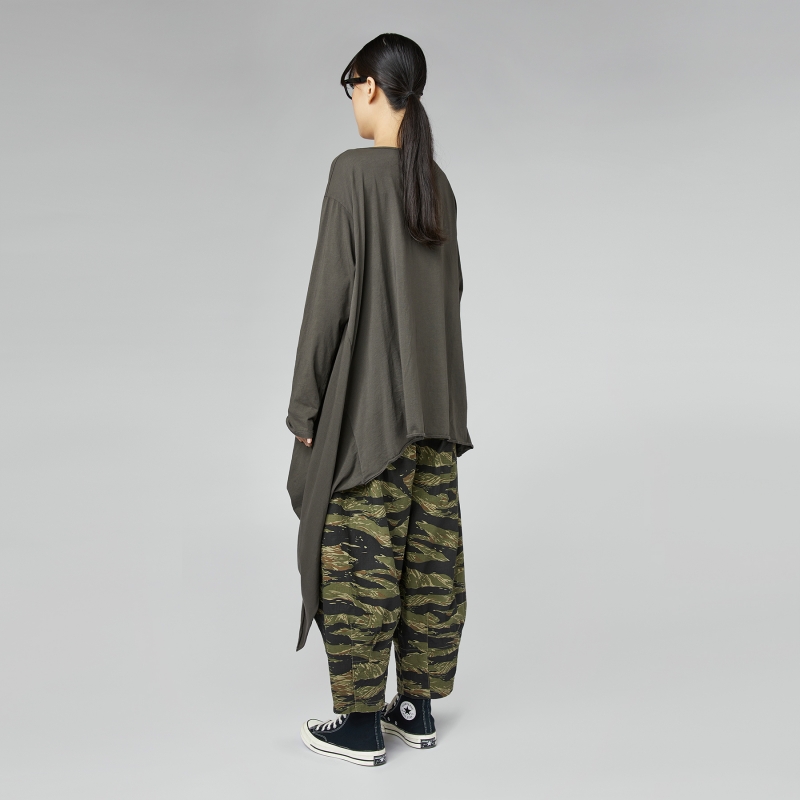 Karottenhose aus Baumwolle mit Militärdruck. Elastischer Bund mit verstellbarem Kordelzug. Seitliche verdeckte Taschen. Bequeme Passform.