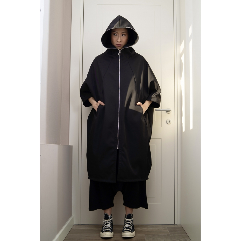 Breiter Mantel aus halbwasserdichtem Stoff mit Kapuze. Reißverschluss vorne. Raglan-Schulter und Fledermausärmel. Versenkbare Taschen im Schnitt. Split in der Mitte vorne. Sehr breite und bequeme Passform.