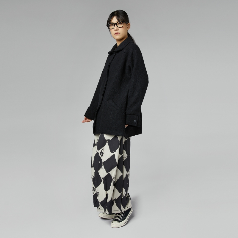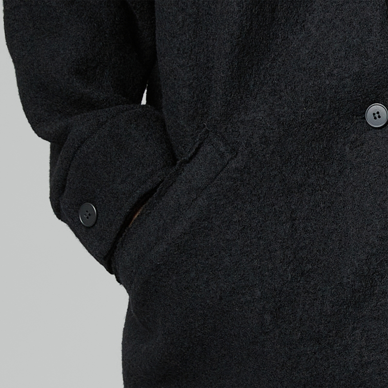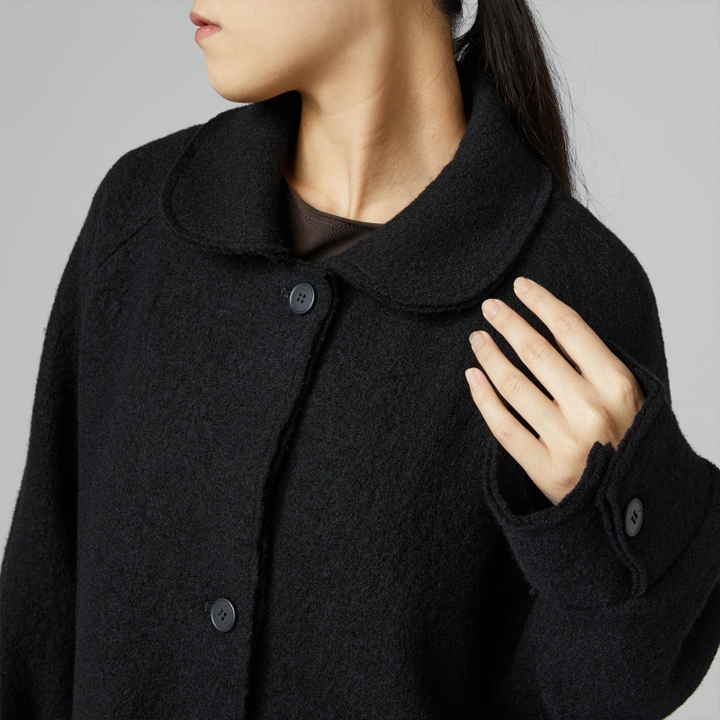 Mantel aus Schurwolle mit Futter. Raglan-Schulter und lange Ärmel mit Manschette. Rundhalsausschnitt. Knopfverschluss vorne. Seitliche Taschen. Kurzer Schnitt. Weite Passform.