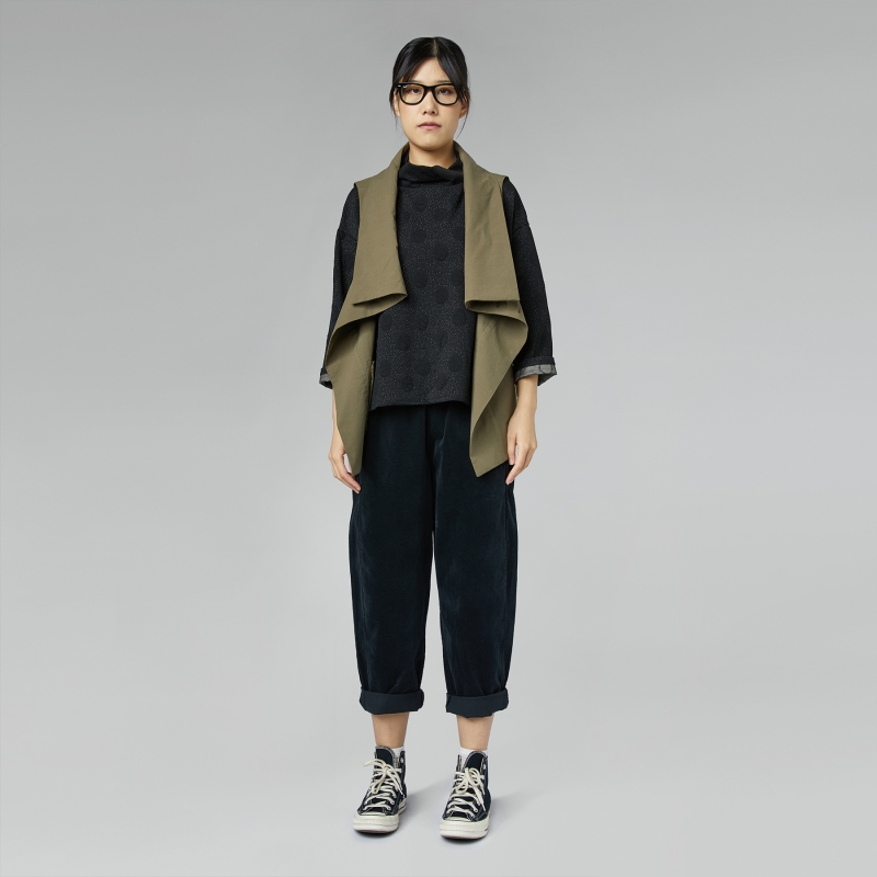 Weste aus 100% Baumwolle. Glaskragen mit spitzer Revers-Spitze. Asymmetrischer Knopfverschluss. Vordere Taschen mit Gewinde. Bequeme Passform.