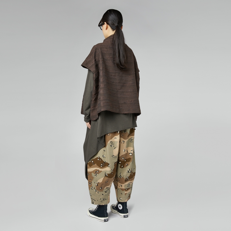 Weste aus einem Stoff, der mit einem geringen Anteil an Wolle verarbeitet wurde. Frontaler Verschluss mit Druckknöpfen. Tiefe Schulter. Weicher Kragen. Ausgestellte Linie. Breite und bequeme Passform.