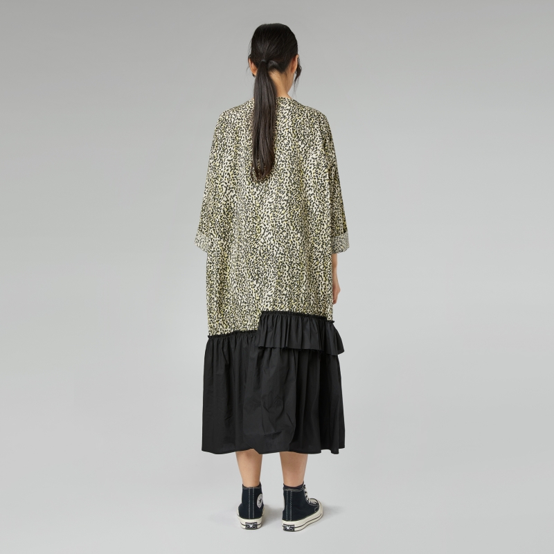 Baumwoll-Kleid mit Frühlings-Animal-Print mit Saum und Rüschen-Details aus schwarzer Baumwolle. Rundhalsausschnitt. Überschnittene Schultern und lange Ärmel. Langer Schnitt. Weite und bequeme Passform.