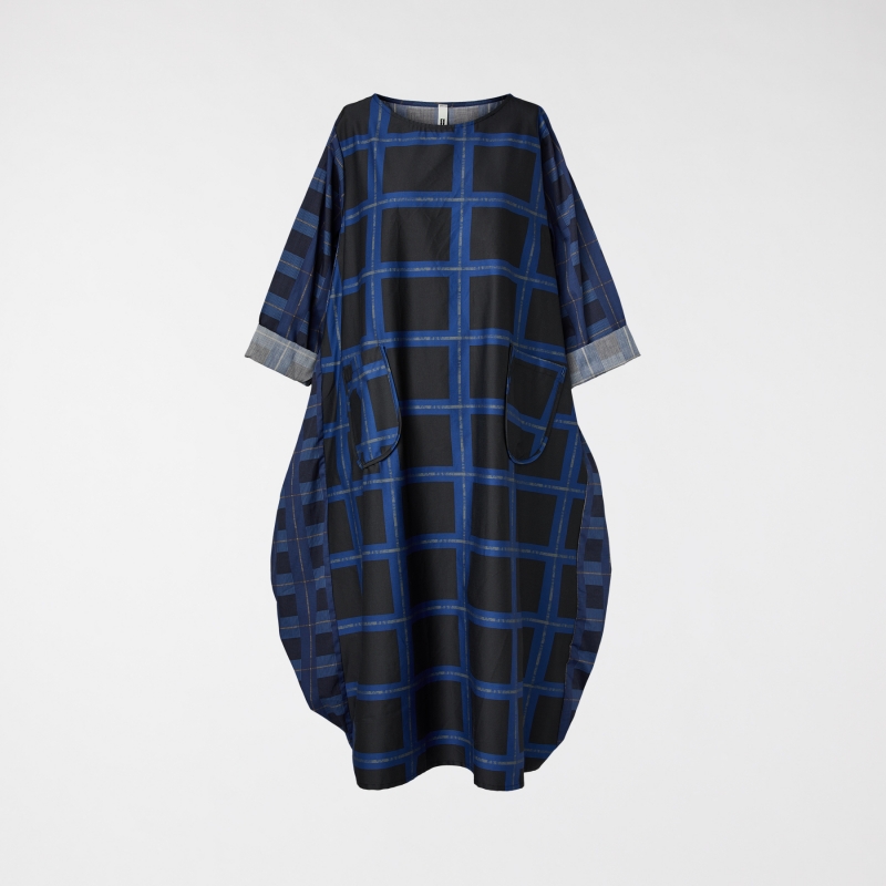 Kleid mit doppeltem blauem und schwarzem Karomuster aus Baumwollstoff. Aufgesetzte Vordertaschen. Reguläre Schultern und lange Ärmel. Eiermuster. Breite und bequeme Passform.