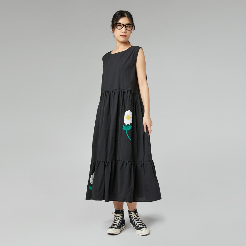 Ärmelloses Kleid mit aufgestickten Margeriten. Rundhalsausschnitt. Seitliche Eingrifftaschen. Faltenrock. Bequeme Passform.