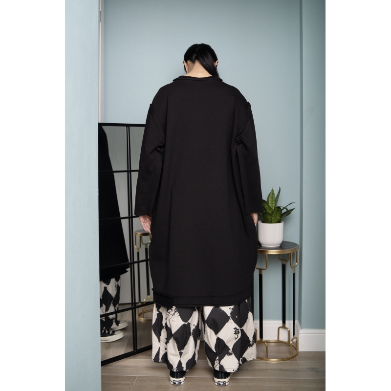 Kleid aus schwerem Sweatstoff in Baumwoll-Mix mit Neopren-Effekt. Rundhalsausschnitt. Schulterfrei und lange Ärmel. Außennähte an den Armausschnitten, an den Schultern und an den Seiten. Wollapplikationen am Rundhalsausschnitt und am Saum. Saum am Saum. Breite und bequeme Passform.