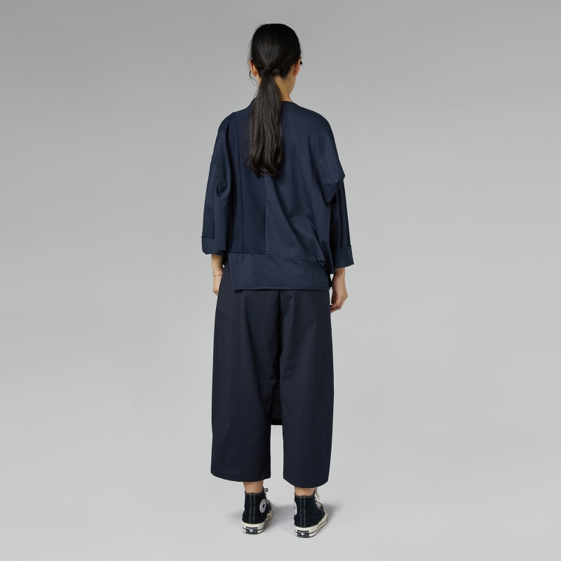 Bluse aus Baumwoll-Jersey mit Strick-Details. Rundhalsausschnitt. Tiefe Schulter und lange Ärmel. Asymmetrischer Schnitt. Saum im Taillenbund. Breite und bequeme Passform.