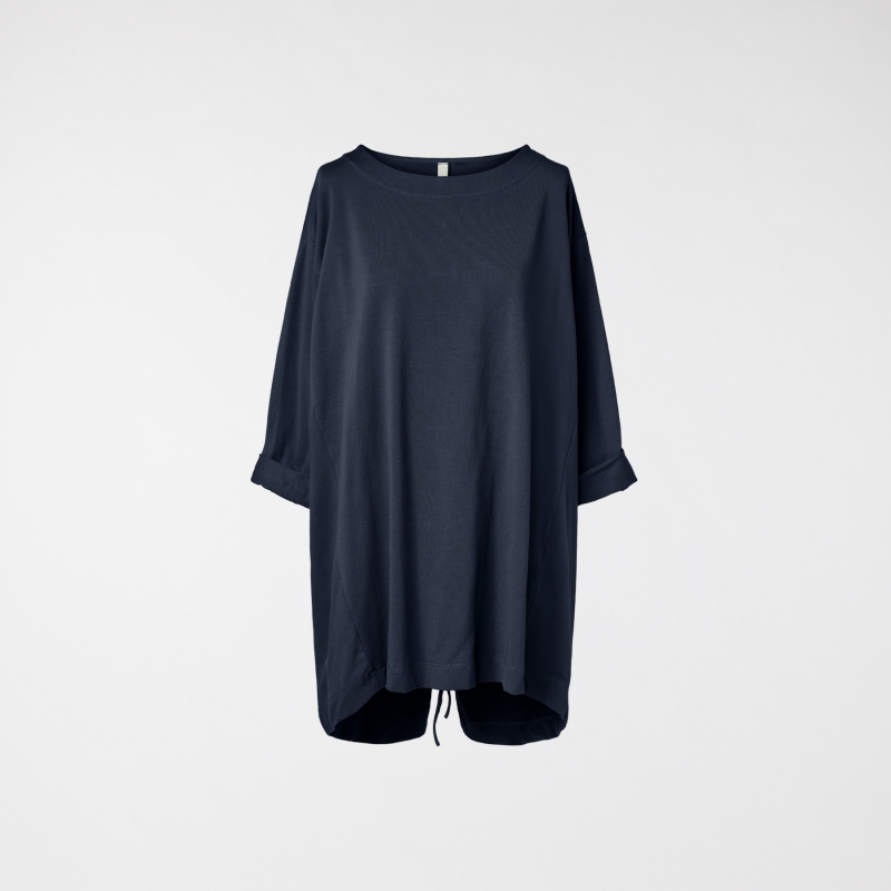 Pullover aus elastischem Baumwoll-Jersey. Rundhalsausschnitt. Tiefe Schulter und lange Ärmel. Gekräuselter Kordelzug auf der Rückseite. Weite, bequeme Passform.