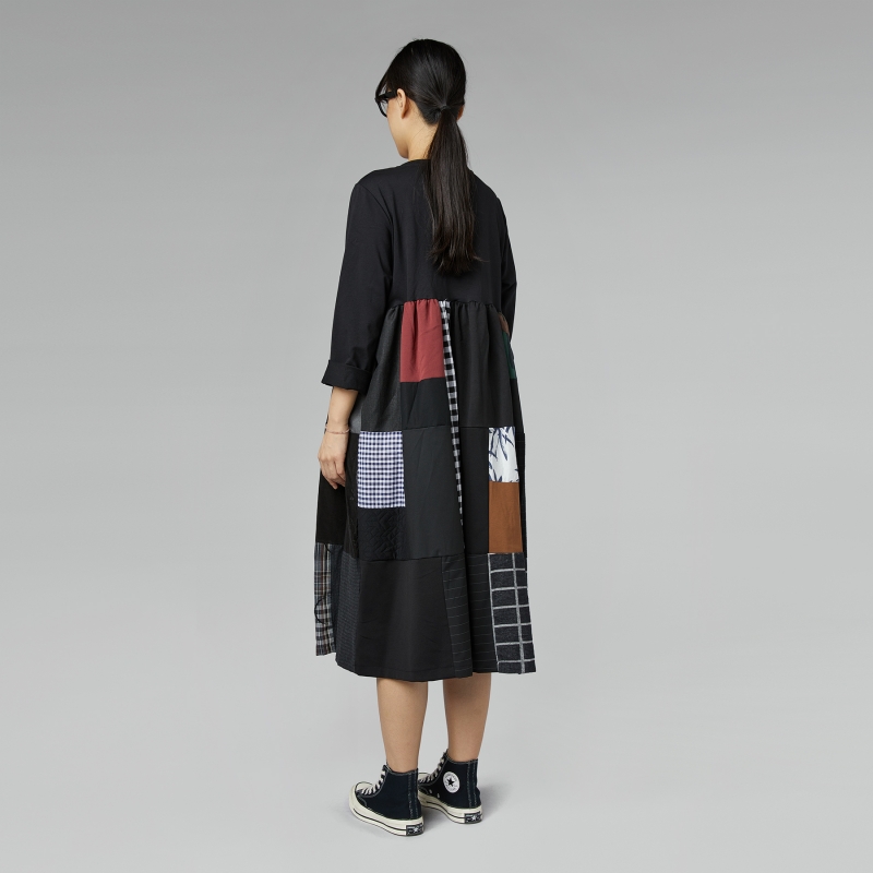 Cotton fleece dress with patchwork skirt. Retractable side pockets. Regular shoulder and long sleeves. Round neckline. Loose and comfortable fit.