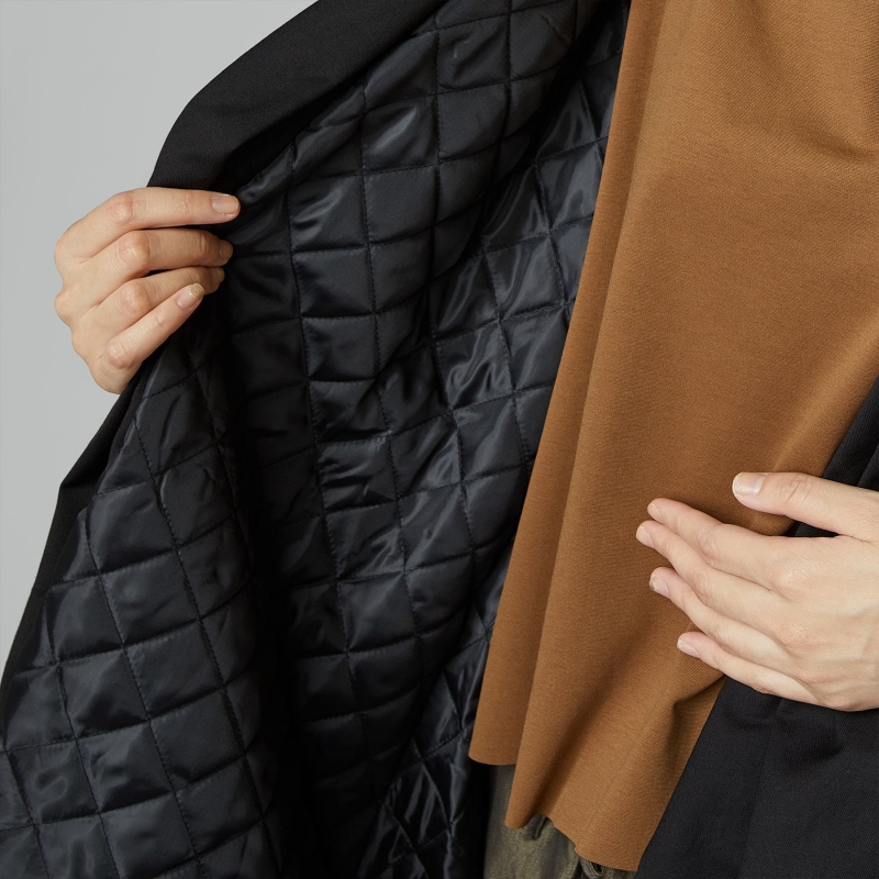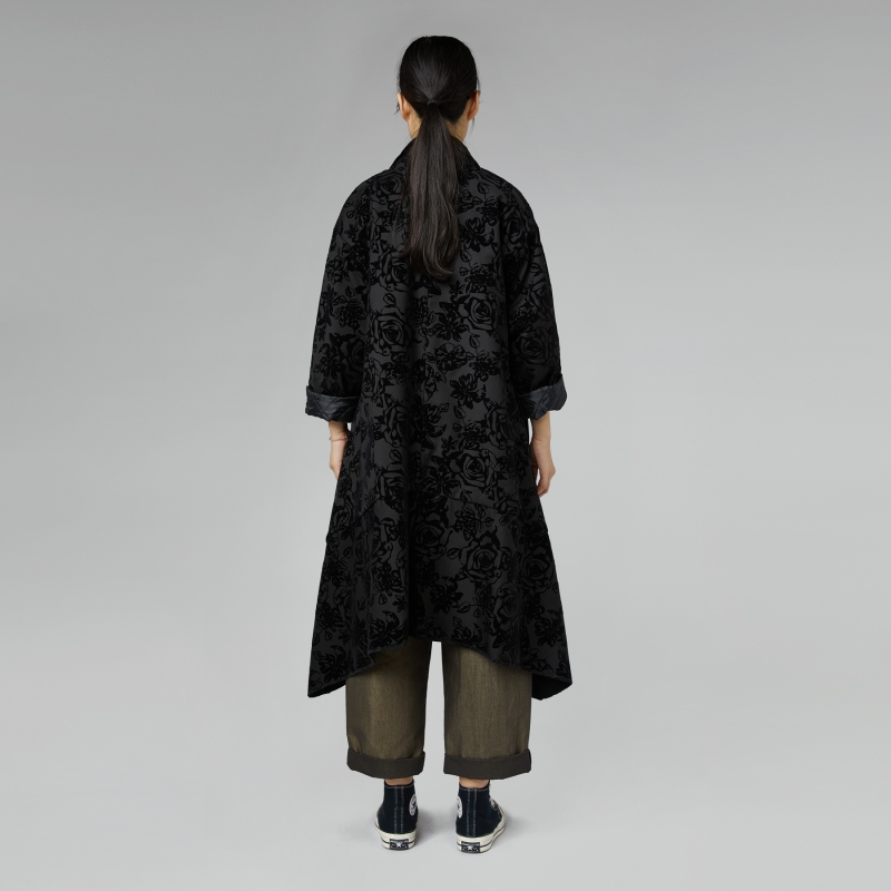 Padded cardigan in damask fabric. Shawl neckline. Shoulder dropped and long sleeves. Longer on the sides. Side patch pockets. Loose and comfortable fit.