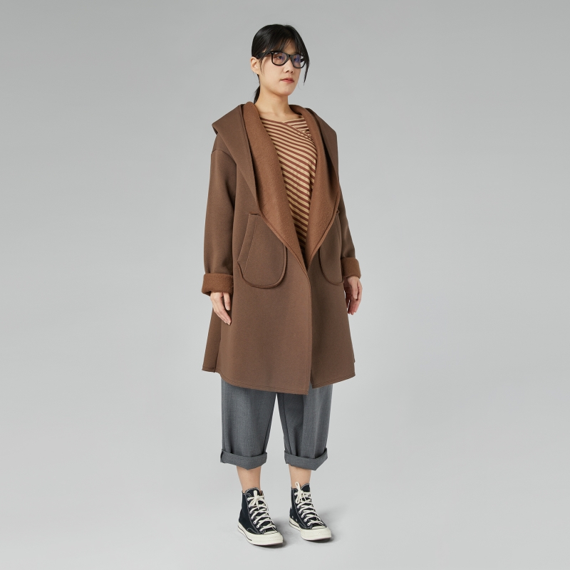 Gauzed cardigan with hood in cotton blend fabric. Shawl collar. Dropped shoulder and long sleeves. Side patch pockets. Warm, wide and comfortable fit.