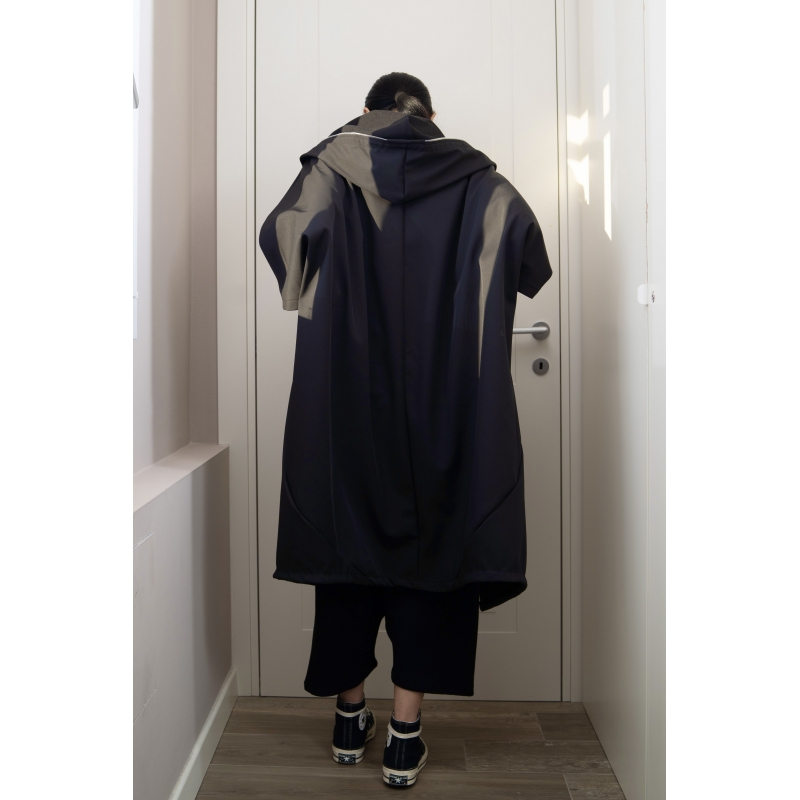 Loose coat in semi-waterproof fabric with hood. Front zip closure. Raglan shoulder and bat sleeves. Concealed pockets inserted into the cut. Split in the center front. Very loose and comfortable fit.