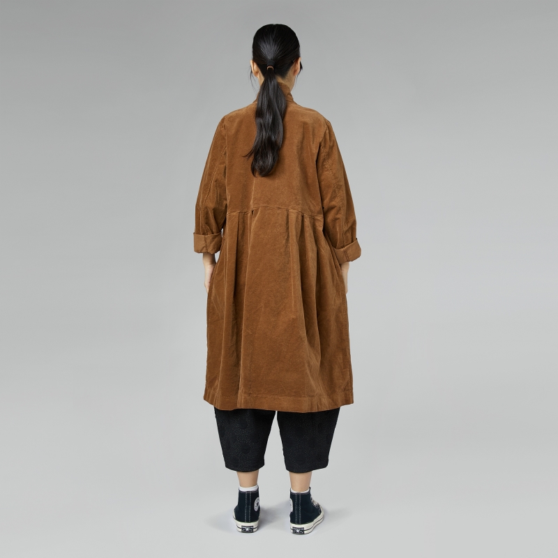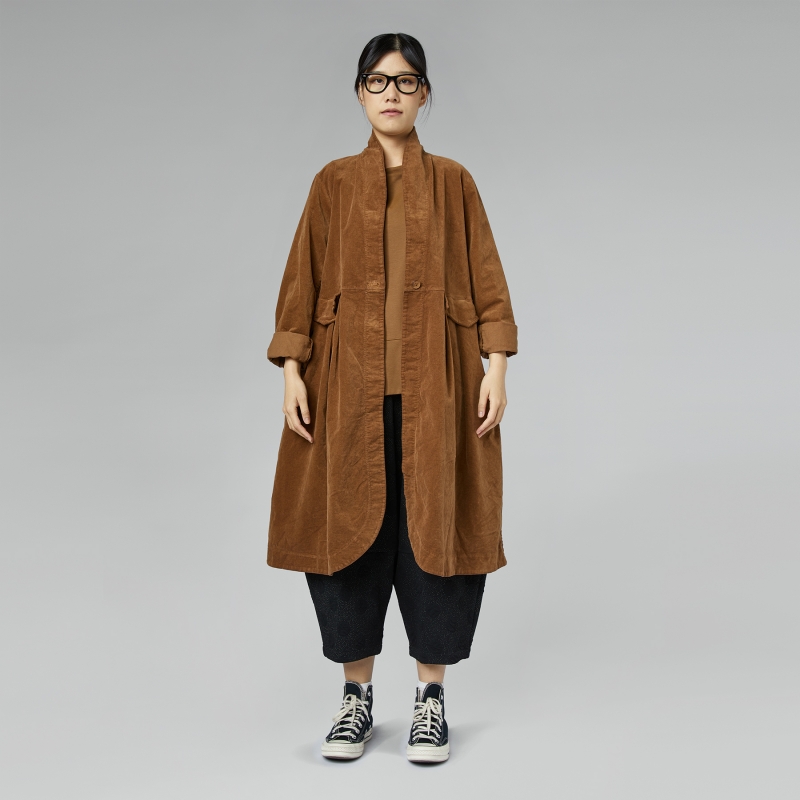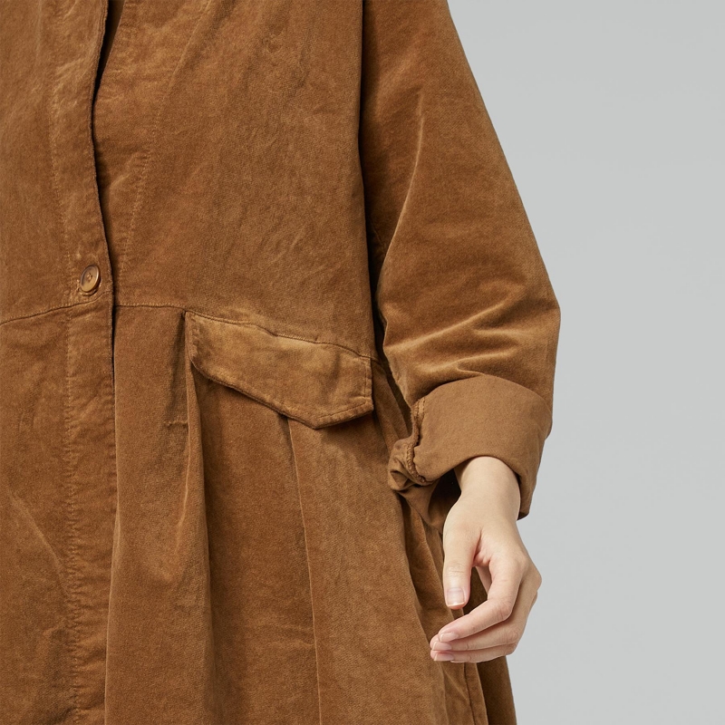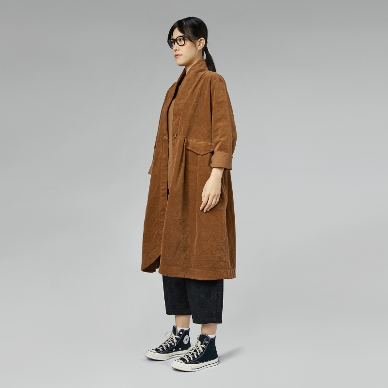 Cotton velvet coat with shawl collar, regular shoulder and long sleeves. Seaming detail at the waist with darts for width. Side pockets inserted in the seam. Fake pockets with flap on the front. Flared cut. Loose and comfortable fit