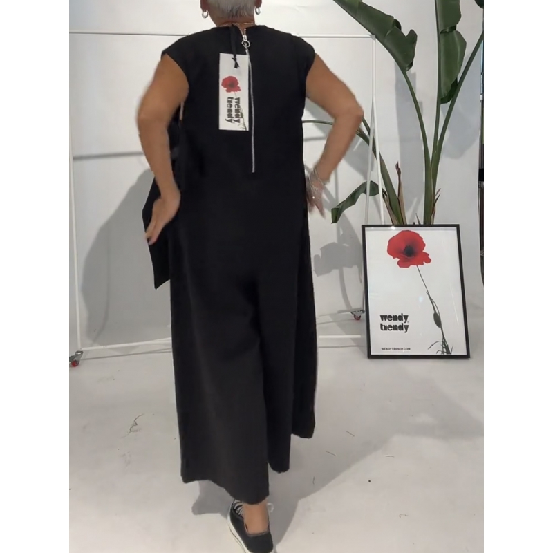 Sleeveless tracksuit with zip closure on the back. Round collar with elastic. Concealed side pockets. Slightly low crotch. Comfortable fit.