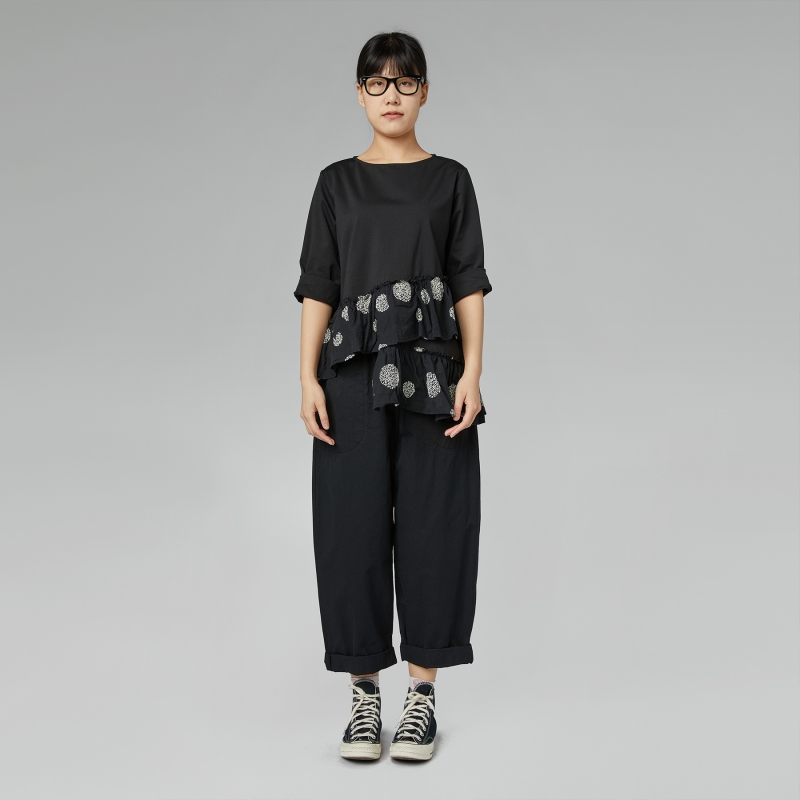 Trousers with cotton fabric lapel. Elastic waistband and adjustable drawstring. Side pockets with visible stitching. Straight line. Comfortable fit.