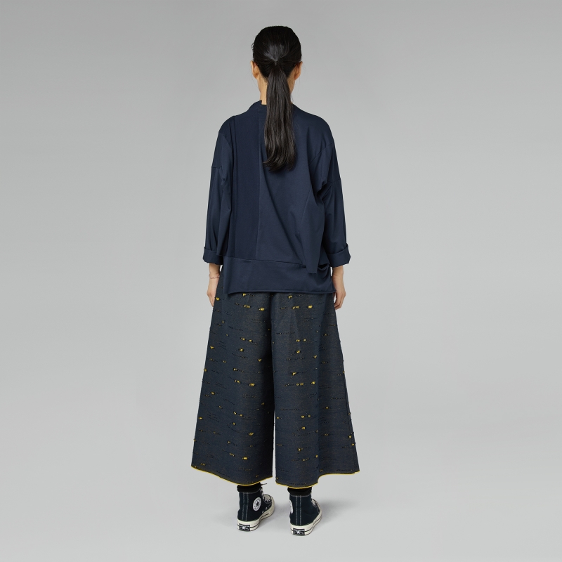 Cotton denim trousers with a torn effect and colourful inlays. Elasticated waistband with adjustable drawstring. Side pockets. Fabric in place. Flared line. Loose and comfortable fit.