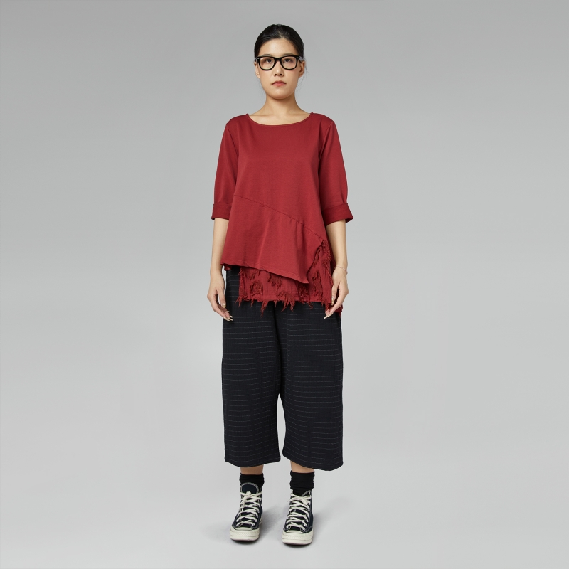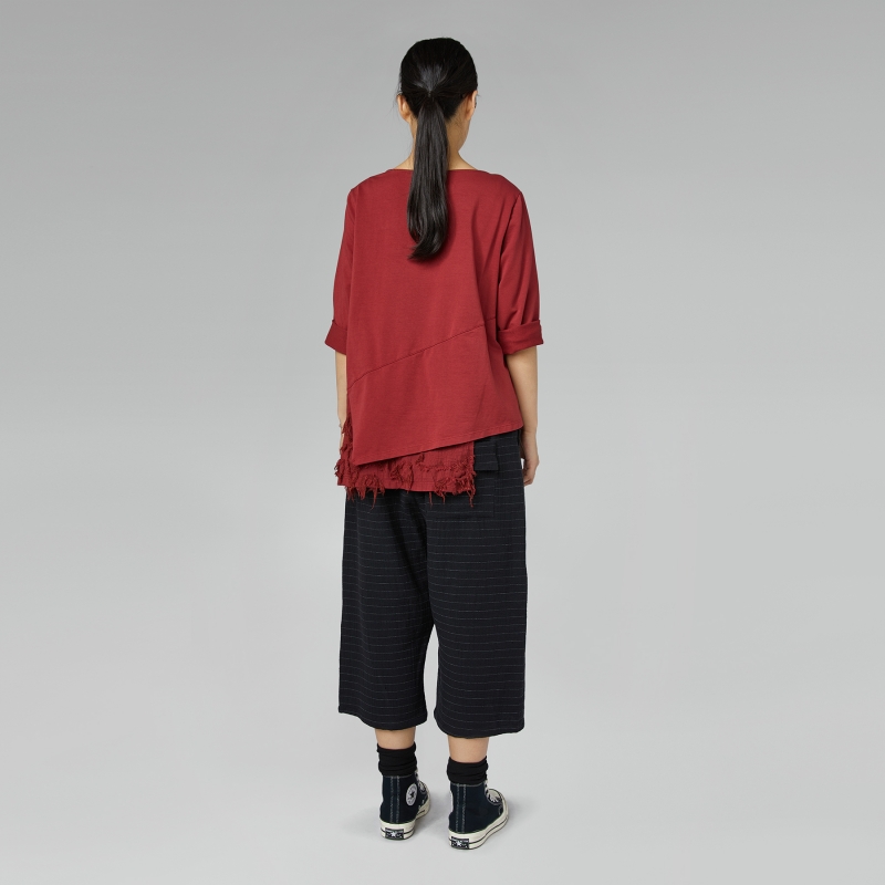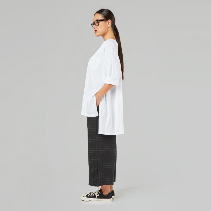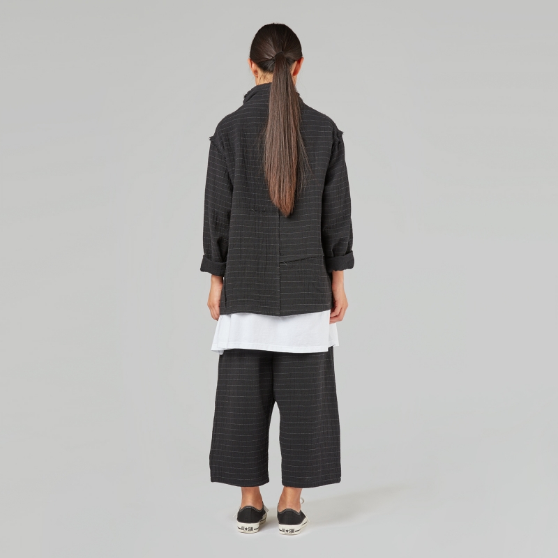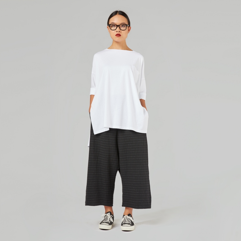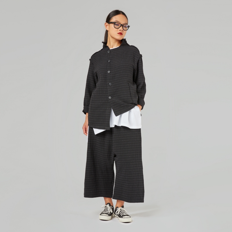 Gauzed trousers in cotton blend pinstriped fabric. Plush interior. Elasticated waistband. Concealed side pockets. Very low crotch. Soft touch. Wide and comfortable fit.