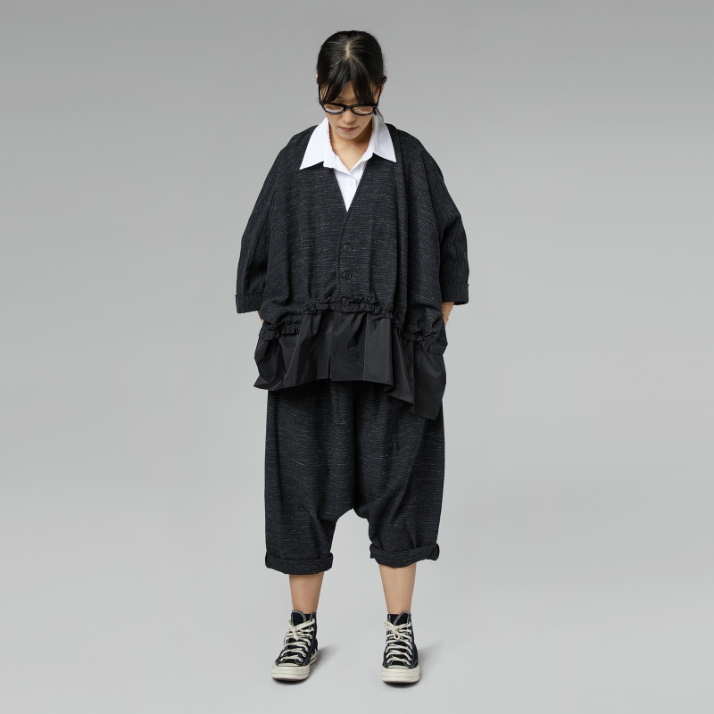 Melange striped fabric trousers in cotton blend. Elasticated waistband. Side pockets inserted into the cut. Very short horse. Loose and comfortable fit.