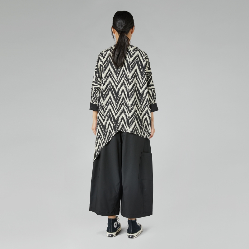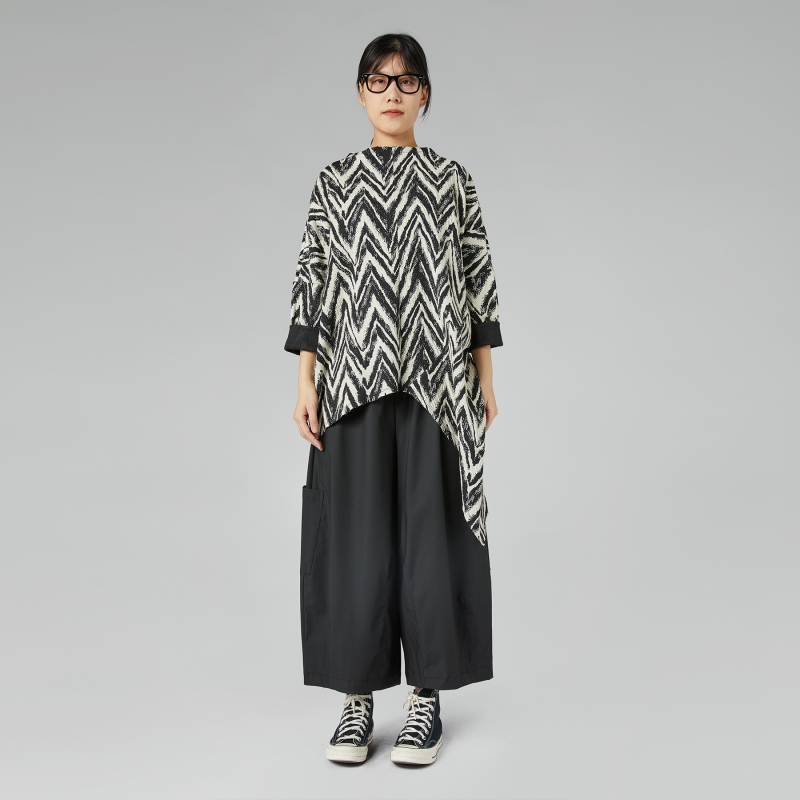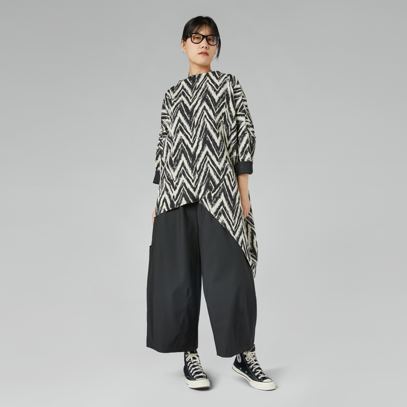 Wide trousers with side patch pockets. Elasticated waistband. Loose crotch. Comfortable fit.