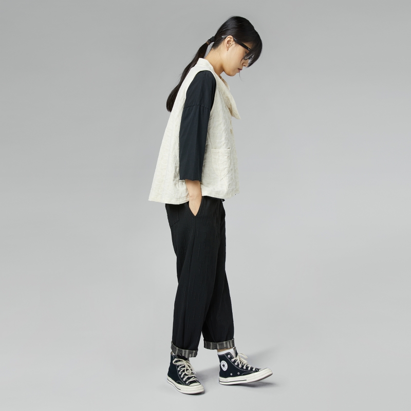 Trousers in hatching embossed effect fabric. Elasticated waistband. Concealed side pockets. Cuff in contrasting pattern. Straight line. Comfortable fit.