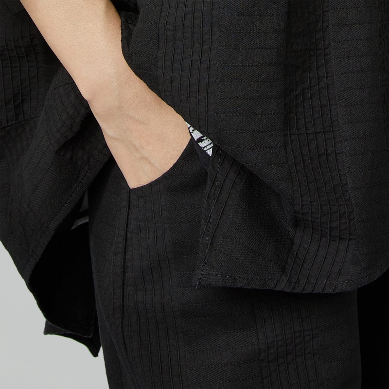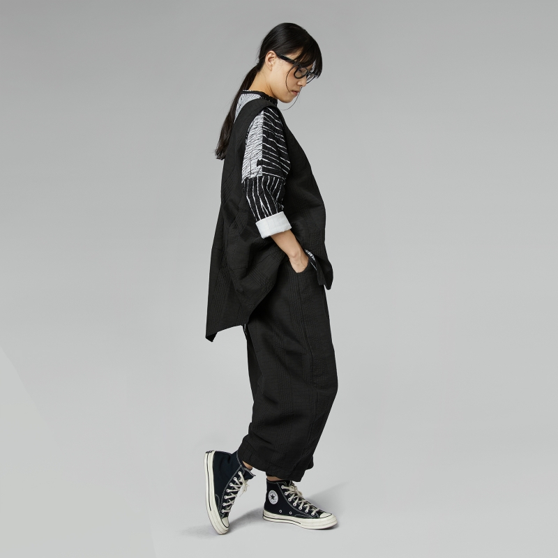 Cotton relief fabric trousers. Elasticated waistband. Side pockets. Loose and comfortable fit.