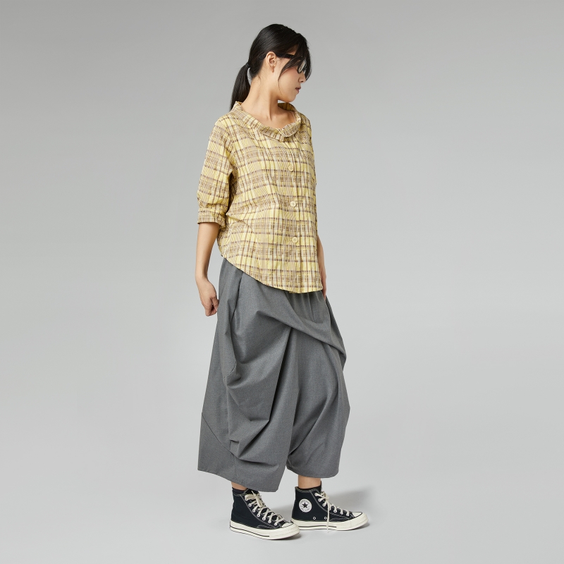 Viscose blend twill skort with pleated detail. Elasticated waistband with loops. Side pockets inserted into the cut. Very short crotch. Side bends on the ankle. Loose and comfortable fit.