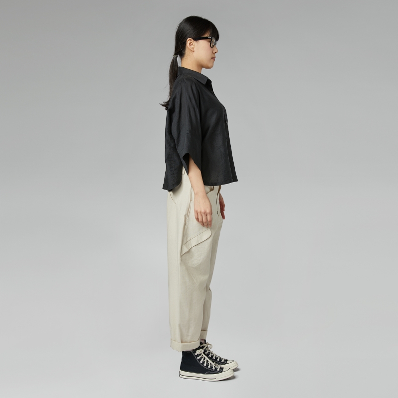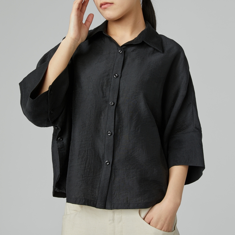 Lightweight shirt in lyocell blend fabric. Pointed collar. Dropped shoulders and short, wide sleeves. Front button closure. Flared line. Buttons closure under the sleeves. Slightly see-through. Loose, comfortable fit.