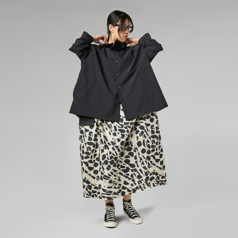 Viscose blend shirt. Lined. Collar with origami effect rouche. Raglan shoulder and long sleeves. Front button closure. Side pockets. Loose and comfortable fit.
