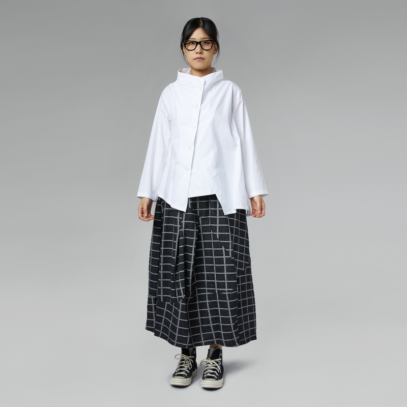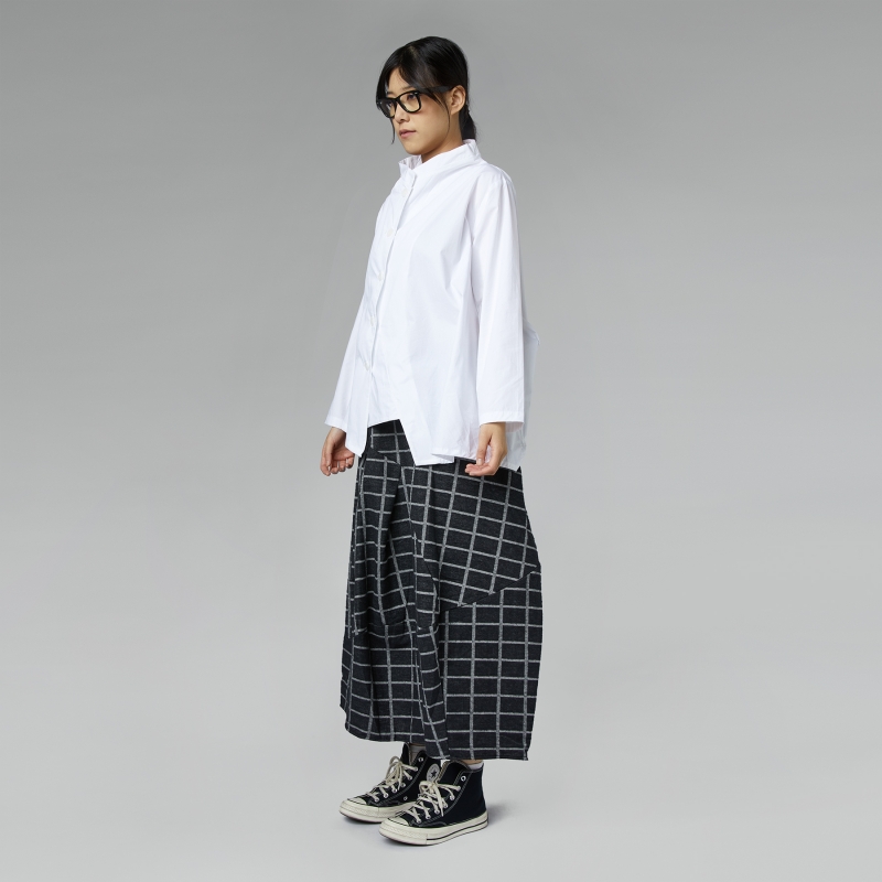 Check skirt in soft cotton blend fabric. Elasticated waistband. Belt loops. Side pockets inserted into the cut. Egg cut. Loose and comfortable fit.