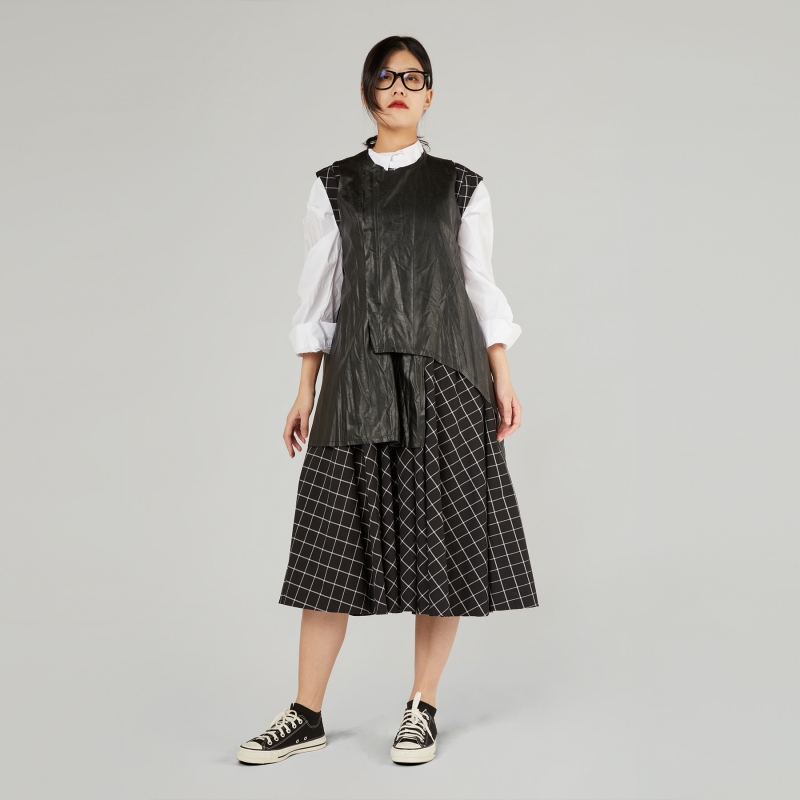 Asymmetric gilet in fake leather, wrinkled effect. Round neckline. Frontal closure with concealed zip. Raw cut hem. Longer n the back. Regular fit.