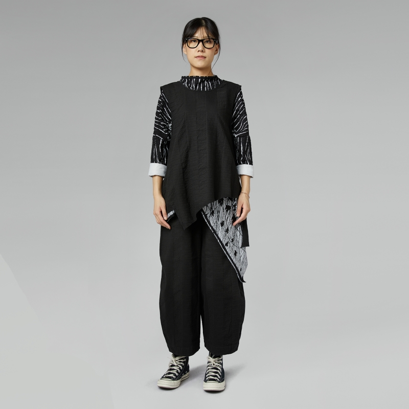 Asymmetrical top in cotton relief fabric. Sleeveless. Round neckline and V-neck on the back. Loose and comfortable fit.