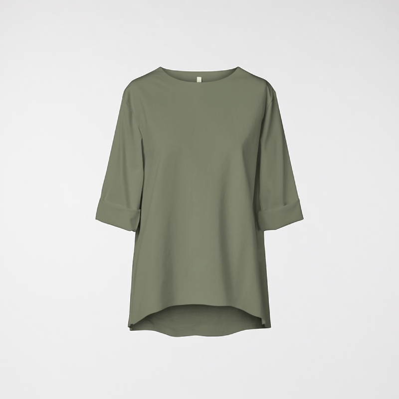 Stretch T-shirt in Punto Milano fabric with round neckline, regular shoulder and long sleeves. Raw cut edges. Longer back. Loose and comfortable fit.