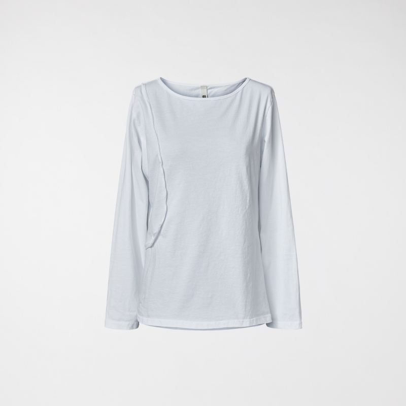 Stretch cotton fleece T-shirt with diagonal stitching. Asymmetrical neckline. Regular shoulder and long sleeves. Asymmetric raw cut hem. Loose and comfortable fit.