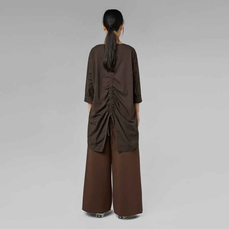 Stretch cotton jersey t-shirt. Round neckline. Dropped shoulder and long sleeves. Curled drawstring on the back. Wide and comfortable fit.