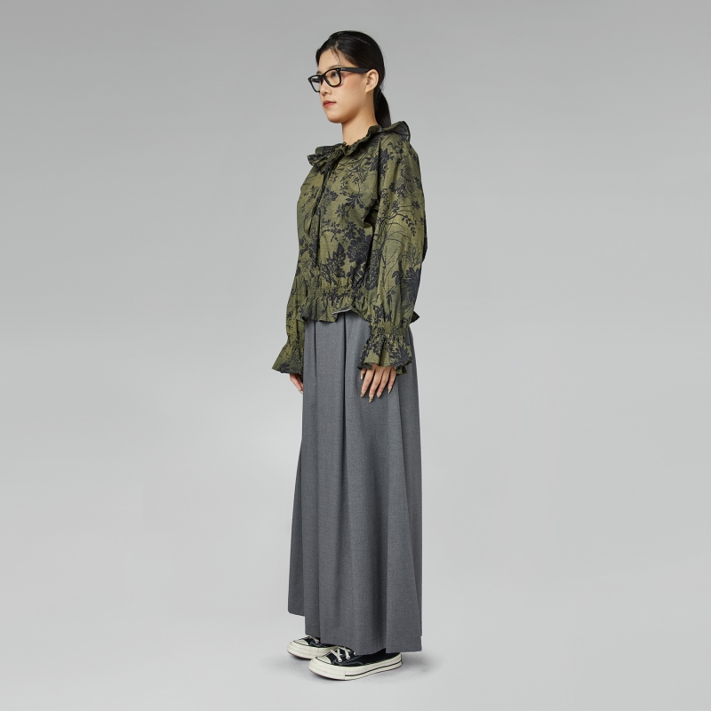 Blusa estampada en 100% algodón. Cuello volante con cierre de cordón. Hombros caídos y mangas largas. Elástico y volantes en el dobladillo y puños. Ajuste regular del cuerpo.