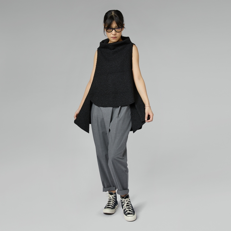 Chaleco sin mangas con cuello alto suave, dobladillo delantero recortado y espalda más larga. Detalle aberturas laterales. Sin cierres. Corte acampanado y desestructurado. Amplio ajuste.