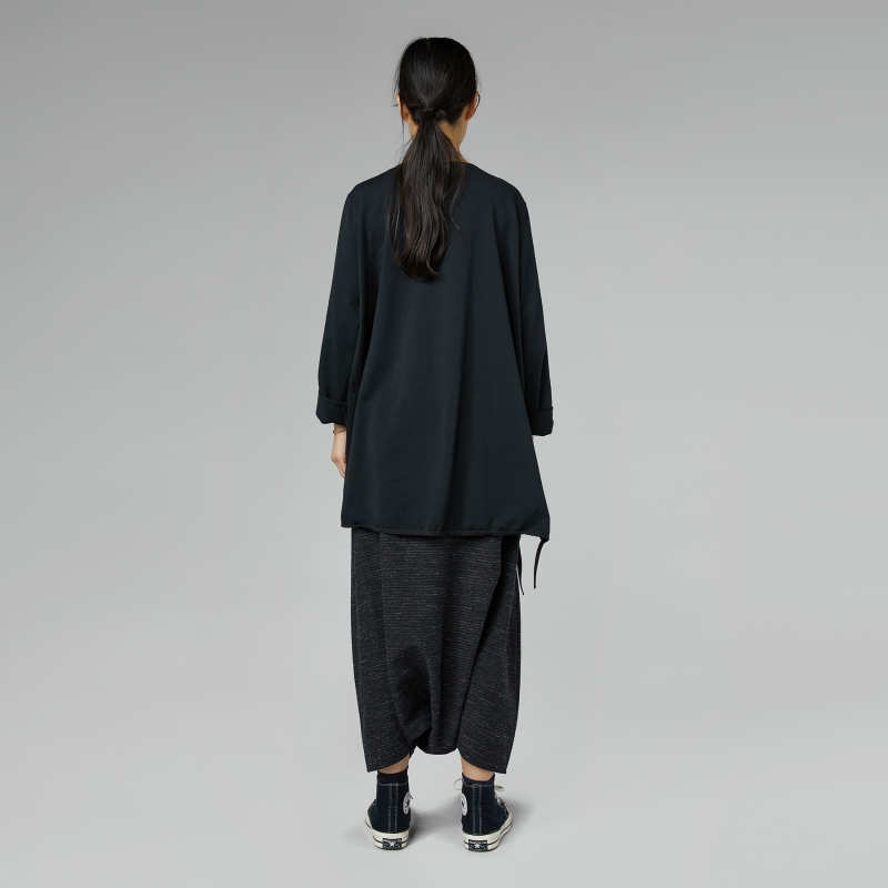 Sudadera ligera en algodón elástico. Escote redondo. Hombros ligeramente bajados y manga larga. Dobladillo plisado con cordones colgantes. Aberturas laterales. Ajuste holgado y cómodo.