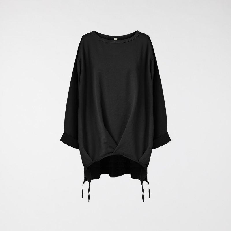 Sudadera ligera en algodón elástico. Escote redondo. Hombros ligeramente bajados y manga larga. Dobladillo plisado con cordones colgantes. Aberturas laterales. Ajuste holgado y cómodo.