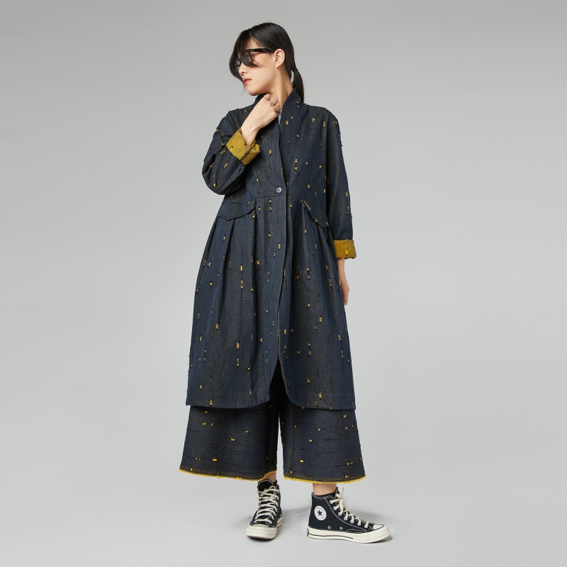 Abrigo en denim con incrustaciones coloridas efecto desgarrado. Cierre de botón. Escote a chal. Hombros regulares y mangas largas. Pliegues en la cintura con falsos bolsillos de solapa. Bolsillos laterales ocultos. Tejido firme. Corte largo. Ajuste cómodo.