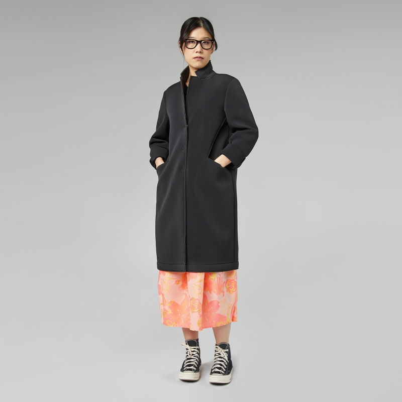 Abrigo de neopreno. Cuello alto. Cierre frontal con botones a presión. Bolsillos laterales insertados en el corte. Hombro regular y mangas largas. Bordes afilados. Ajuste cómodo.