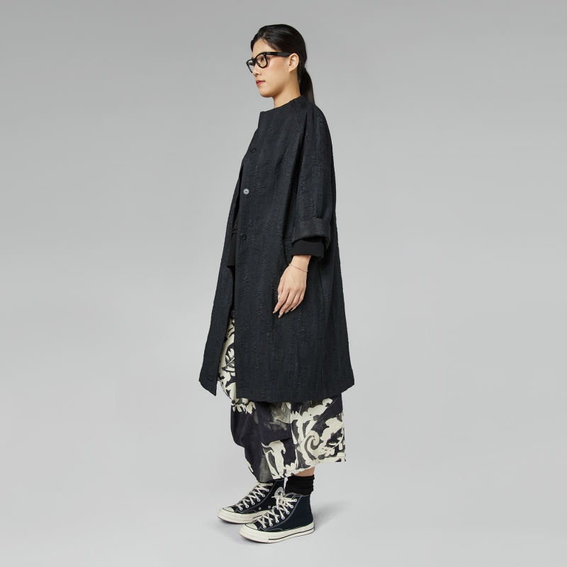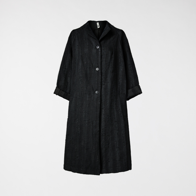 Abrigo ligero con un porcentaje de algodón y lana. Hombros raglán y mangas largas. Cuello redondo. Cierre frontal con botones. Bolsillos laterales. Pliegues en la espalda. Corte medio largo. Ajuste cómodo.