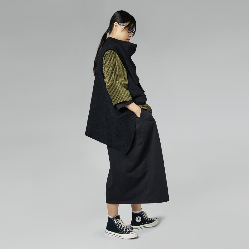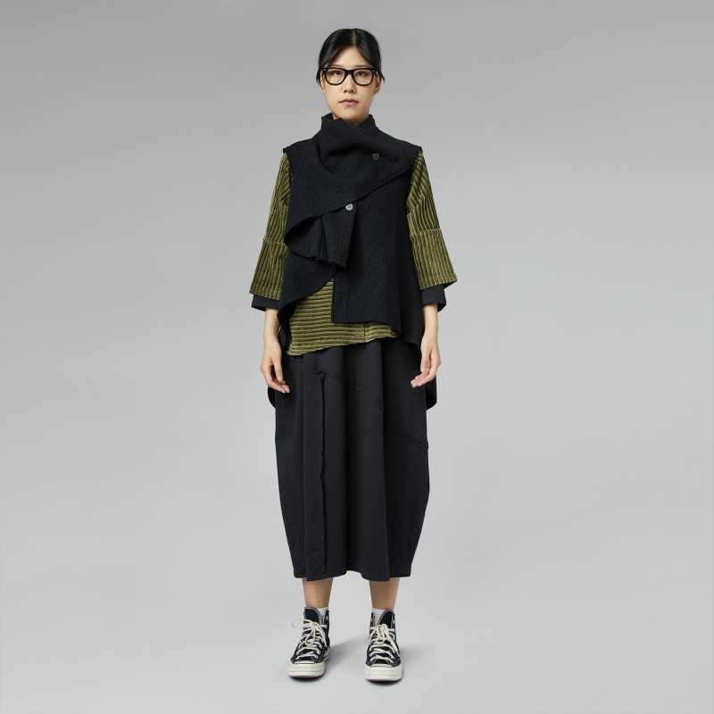 Chaleco de lana virgen. Doble cierre frontal con botones. Efecto cuello drapeado. Más largo en la espalda. Corte asimétrico. Ajuste cálido.