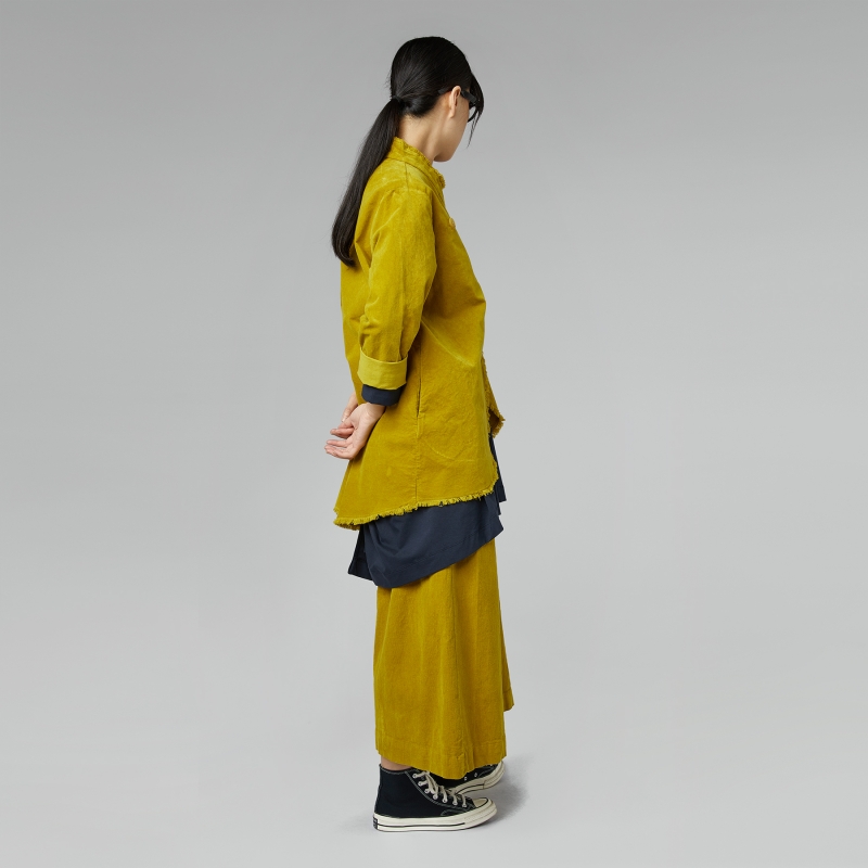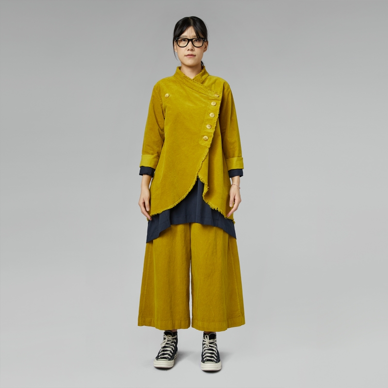 Chaqueta de terciopelo de algodón. Cierre frontal asimétrico con botones. Hombro regular y mangas largas. Dobladillo deshilachado. Bolsillos laterales insertados en el corte. Fondo dobladillo redondeado. Más largo en la espalda. Línea acampanada. Ajuste regular.
