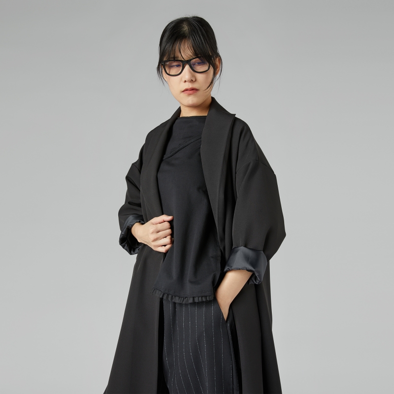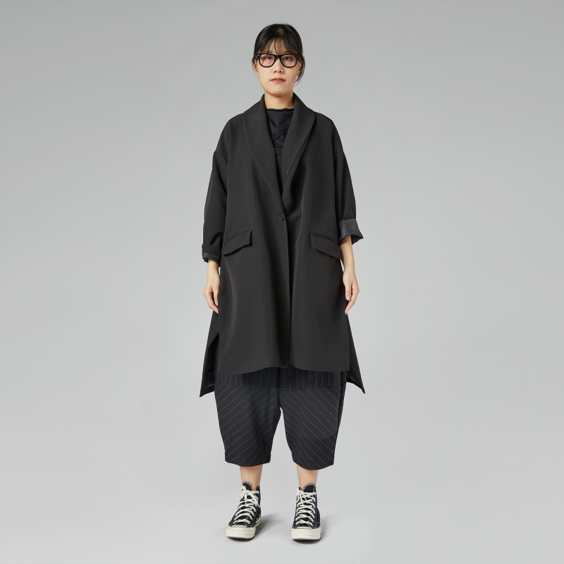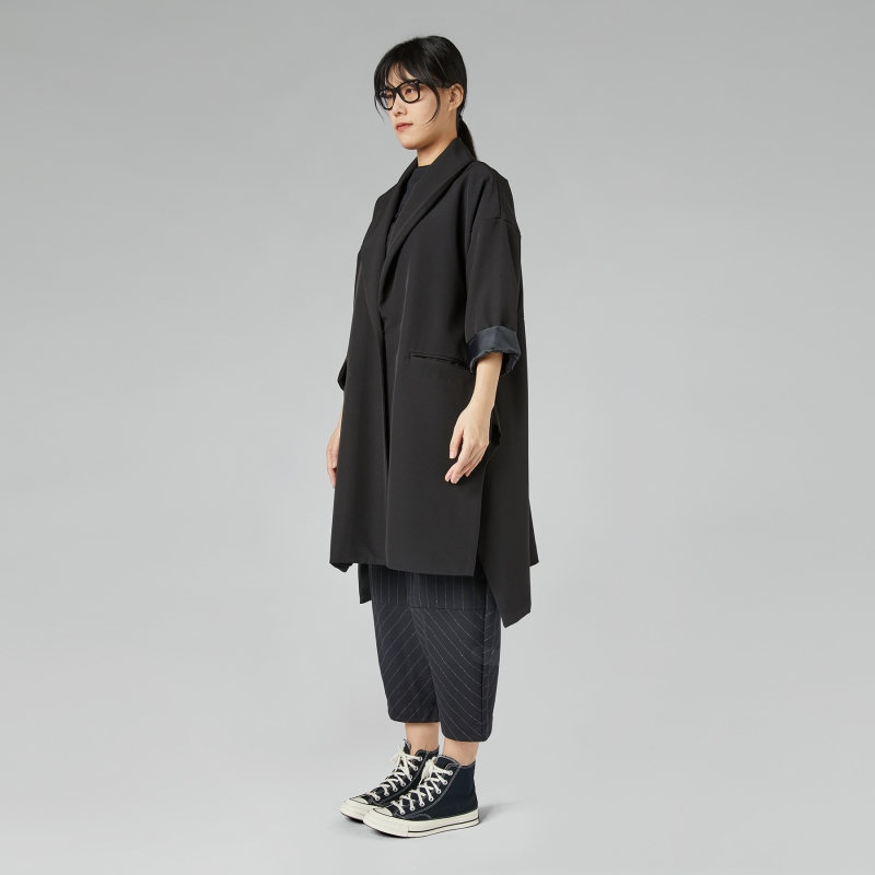 Chaqueta forrada con aberturas laterales. Cierre frontal de botón. Cuello chal. Hombros caídos y mangas largas. Bolsillos delanteros con solapa. Línea de kimono. Ajuste amplio y cómodo.