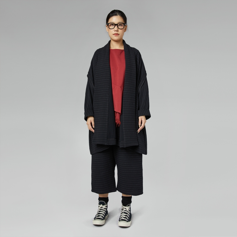 Pantalón de gasa en mezcla de algodón con rayas. Interior de felpa. Cintura elástica. Bolsillos laterales ocultos. Entrepierna muy baja. Tacto suave. Ajuste amplio y cómodo.
