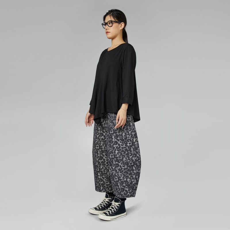 Pantalón de algodón con estampado de leopardo. Banda elástica en la cintura. Bolsillos laterales ocultos. Corte balloon. Ajuste amplio y cómodo.