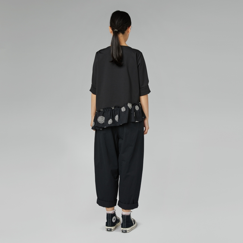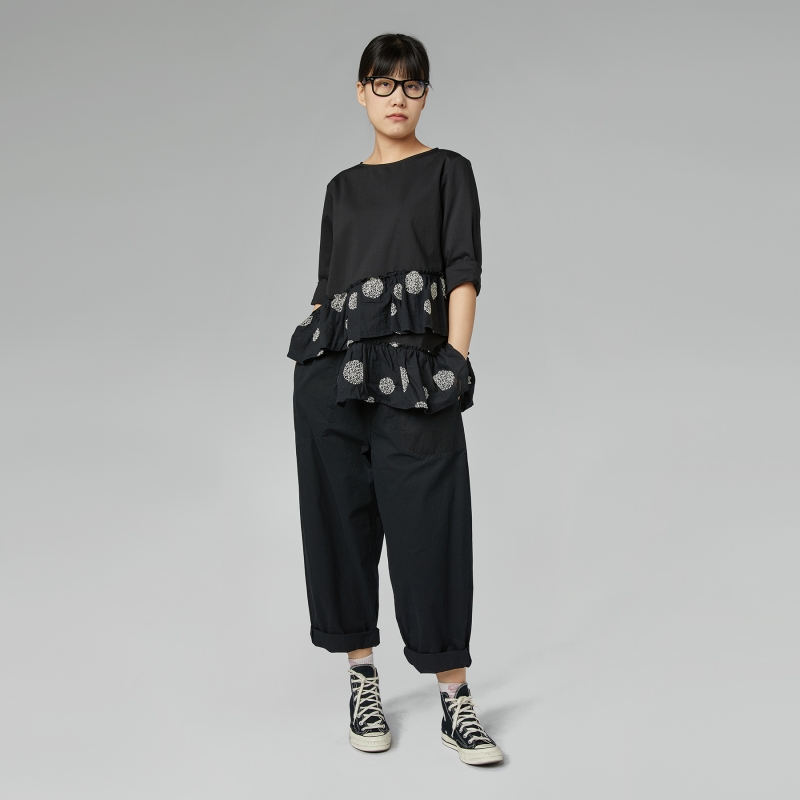 Pantalón con solapa en tejido de algodón. Banda elástica en la cintura y cordón ajustable. Bolsillos laterales con costura visible. Línea recta. Ajuste cómodo y cómodo.