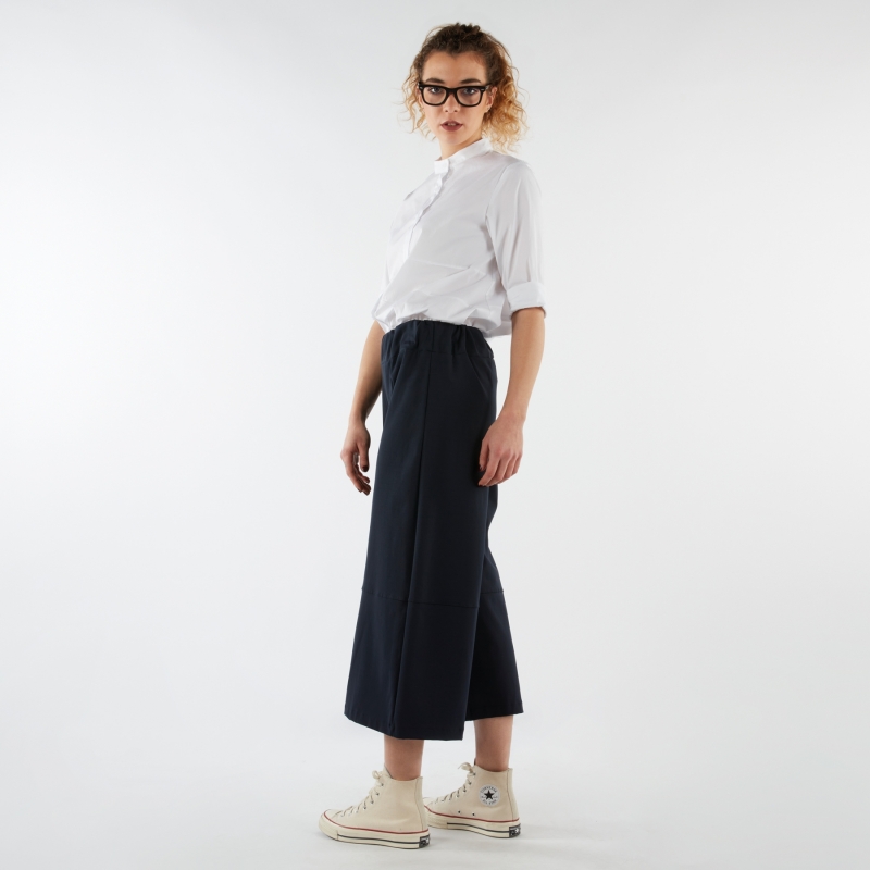 Pantalón en tejido Punto Milano mezcla de algodón elástico. Banda elástica en la cintura. Detalle de costura debajo de la rodilla. Pierna ancha. Ajuste cómodo.