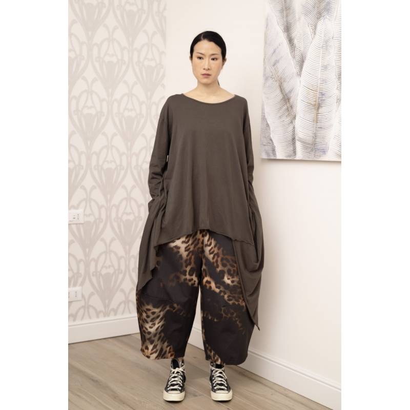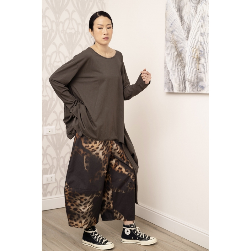 Pantalón de algodón con estampado de leopardo. Banda elástica en la cintura. Bolsillos laterales ocultos. Corte balloon. Ajuste amplio y cómodo.